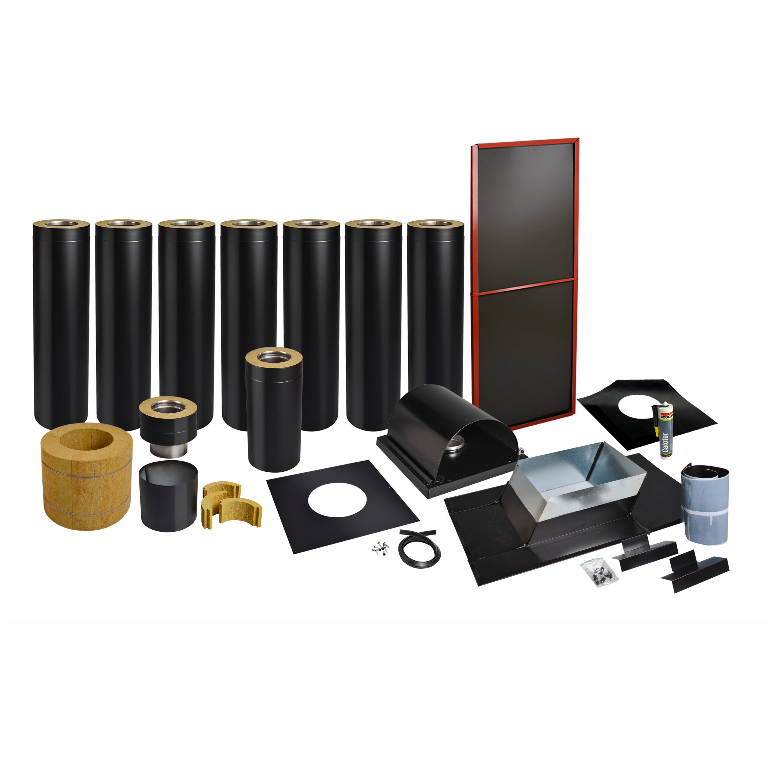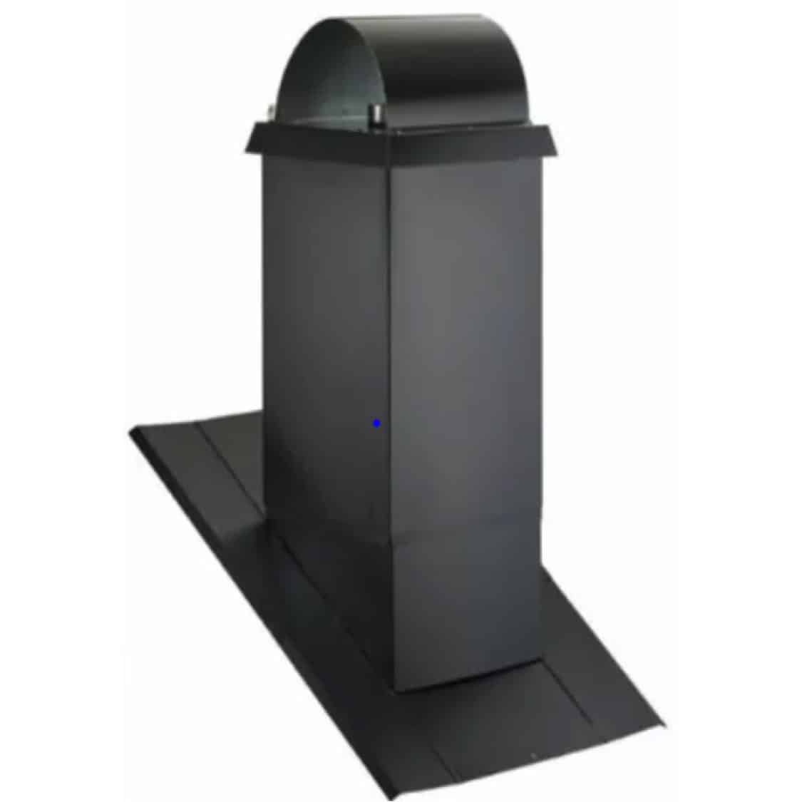Kopplingsstycke, isolering och täcksvep, isolerade och lackerade skorstensmoduler i svart, bjälklagsisolering, 1 st fyrkantig hel täckplåt, diffusionsspärr, pannkitt. Komplett fyrkantig skorstenshuv, höjd maximalt 1700 mm, eller komplett rund skorsten ovan tak.