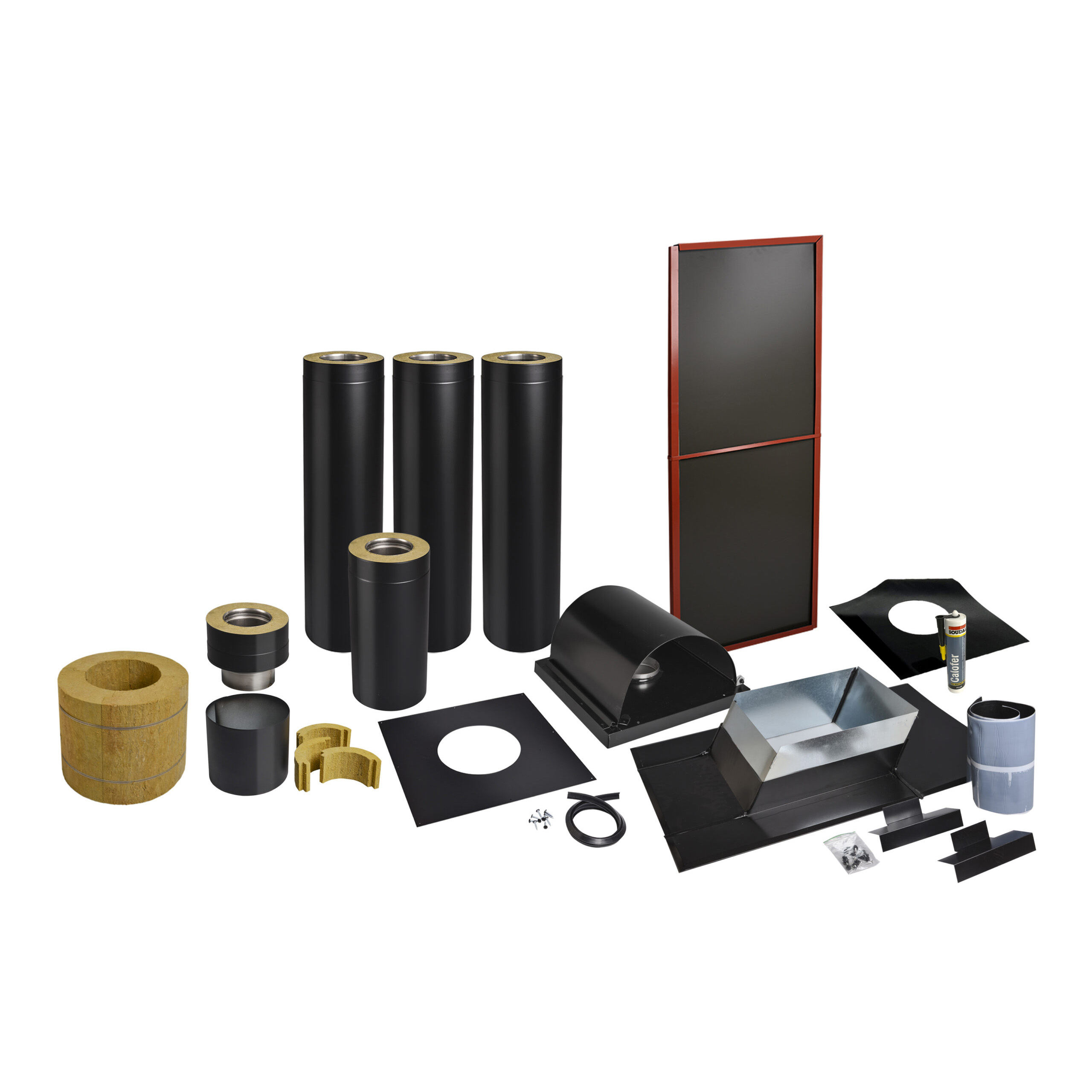 Kopplingsstycke, isolering och täcksvep, isolerade och lackerade skorstensmoduler i svart, 1 st fyrkantig hel täckplåt, diffusionsspärr, pannkitt. Komplett fyrkantig skorstenshuv, höjd maximalt 1700 mm, eller komplett rund skorsten ovan tak.